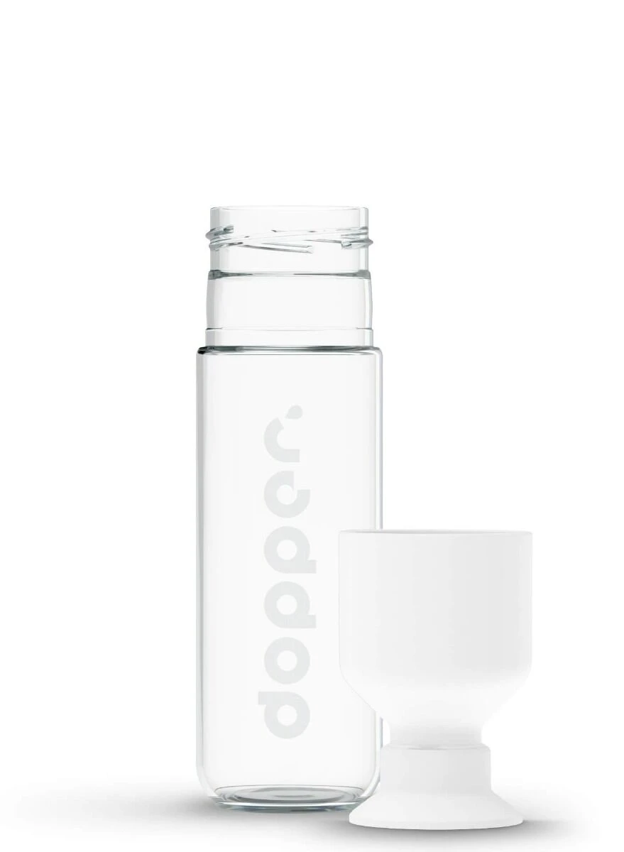 De Dopper waterfles is vervaardigd uit borosilicaatglas staal en BPA-vrij kunststof en gebruikt u voor het meenemen van kraanwater. Met het gebruik van de Dopper steunt u de drinkwaterprojecten van de Dopper Foundation & Simavi in Nepal. De fles is geschikt voor koude dranken en ontworpen door de Nederlandse Rinke van Remortel. Omdat de fles van glas is geeft deze geen smaak af aan het drinken.