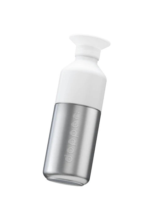 De Dopper steel waterfles is gemaakt van roestvrij staal en wit kusntof. De fles is 19 cm hoog en heeft de diameter van 6 cm, de inhoud van de drinkfles bedraagt 350 ml.