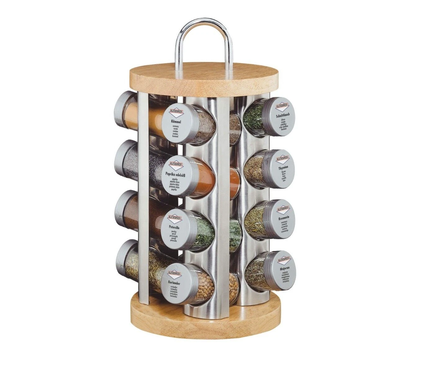 Dit Küchenprofi kruidenrek is vervaardigd uit hout en roestvrij staal en kan op zijn voet draaien. Het kruidenrek heeft een diameter van 20 cm en is 35 cm hoog.