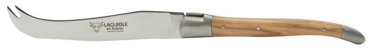 Het mes heeft een aan het uiteinde golvende uitloop in 2 punten. Handig om de kaas mee op te prikken na het snijden. Sommige Laguiole en Aubrac kaasmessen hebben een houten handgreep. Vet deze regelmatig in met olie, zodat de greep een optimale staat behoudt.