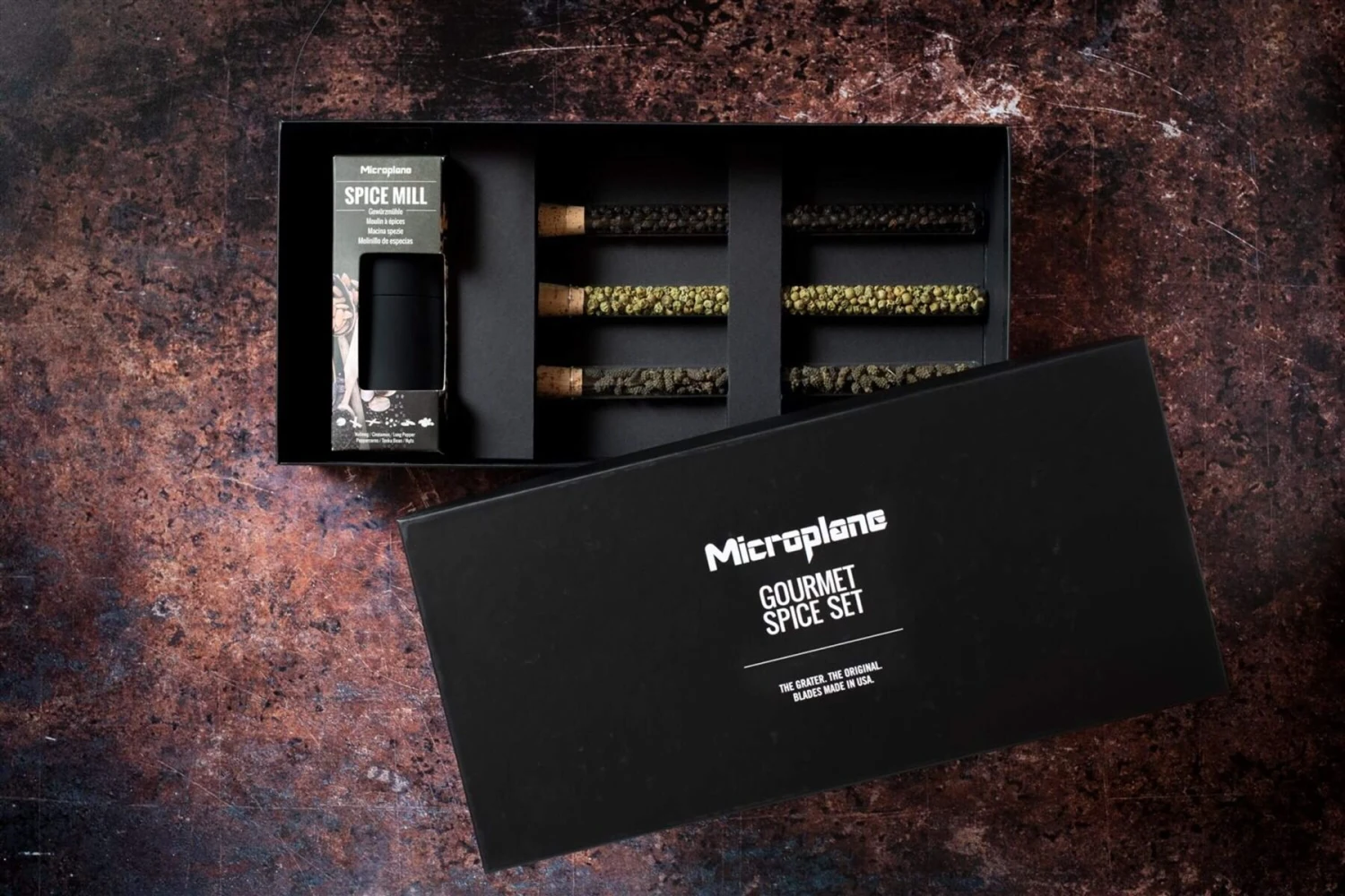De Microplane kruidenmolen is gemaakt van zwart kunststof en heeft een rasp van roestvrij staal. De rasp is in totaal 11,5 cm hoog en heeft een diameter van 5 cm. De rasp heeft een fijn profiel voor het raspen van harde specerijen als kaneel en nootmuskaat. Door de het bovenste deel in het het onderste te draaien wordt de muskaatnoot langs de rasp gehaald. Eventuele voorraad kan worden opgeborgen in het bovenste deel van de rasp. De cadeauset wordt geleverd met drie soorten pepers