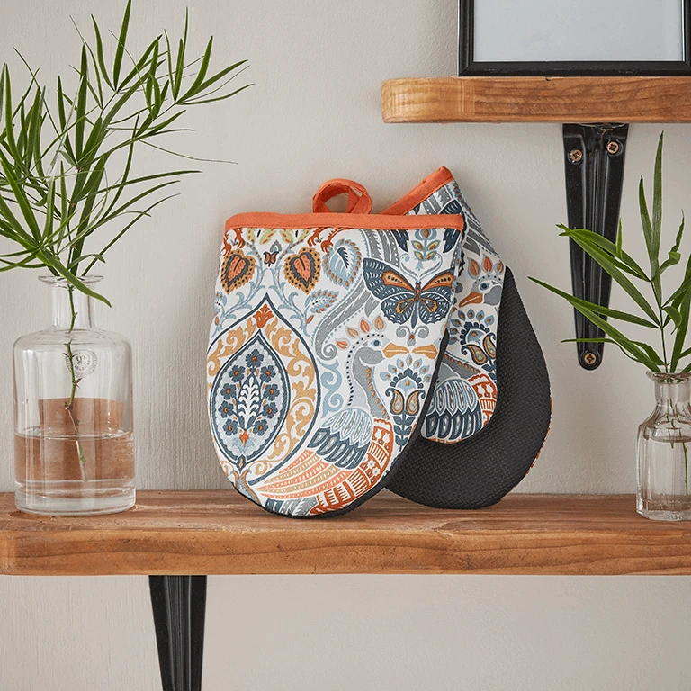 De oranje Double Micro ovenwanten set is perfect voor het hanteren van hete potten en schalen tot 100 graden Celsius. De handpalmen van neopreen beschermen tegen stoom en heet water en helpen uw vingers veilig te houden bij het hanteren van uw nieuwste culinaire meesterwerk. Geïnspireerd door design uit de kunst- en ambachtsbeweging. Dit Cotswold-ontwerp bevat fictieve vuurvogels die zijn gedrukt in een blokprintstijl. Kijk dichterbij om te zien dat het patroon bestaat uit wervelende bloemen en bladeren.